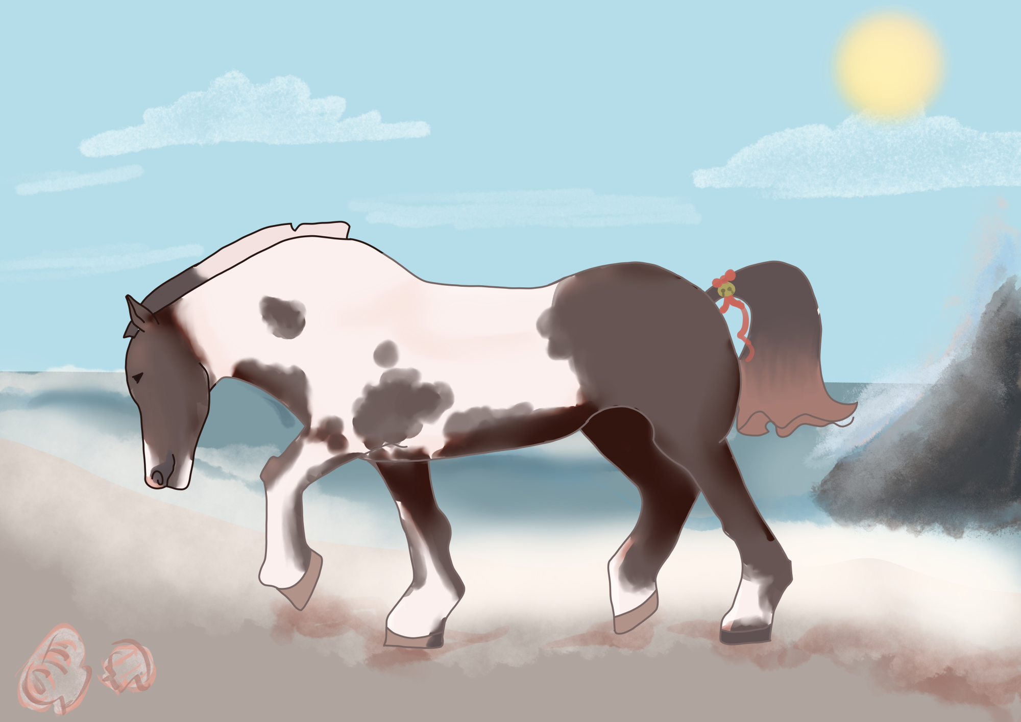 For a moment, she wasn't sure if the mare would bolt off or simply ignore the snack in front of her. Thankfully, her question wasn't held in suspense for long. The mare took a few steps toward the food, nudged it with her gray-ish snout, then took a gentle sniff. In a moment of bated breath, the mare began to nibble at the carrot, seeming to prefer gobbling it up since it would get covered in sand if she didn't. A smart mare, the girl thought, we'll get along just fine.