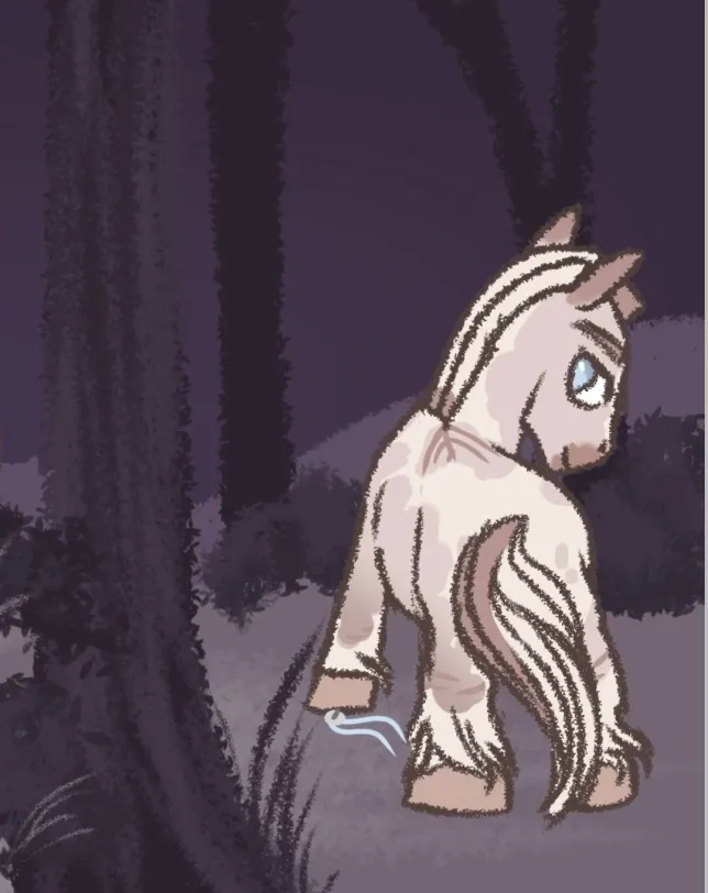 Her head snapped toward the sound, legs moving toward it before her better judgement could tell her not to. When she peered over the edge of the porch, a large white blob was settled within the bushes. At first, she gasped. But as she looked closer, she noticed the sharp, short mane and flowing tail of the creature. This wasn't just any animal, it was a pony! The same one they saw on the way home, no less.