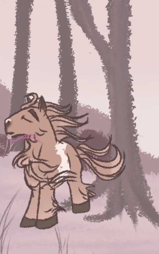 The lavender stallion still held the bell in his mouth, his jaw tightly clasped around the shiny thing, so tiny that she feared one wrong swing of his head would send it barreling down his throat. But, as delicate as his hold was, it was firm. He experiments with jingling with the bell, the bright tone of the silver thing creating almost some kind of music in the forest's quieteness and serenity. He seemed endlessly amused by it; honestly, she would be too if she were a horse in the wild. If all she ever heard were the neighs of others and the chirps of birds and all she ever saw was the forest beyond, something as shiny and as distinct and foreign as a bell would capture her attention for hours too. He seemed like a curious stallion then, a classic trait of a Teddy Cob, she mused.